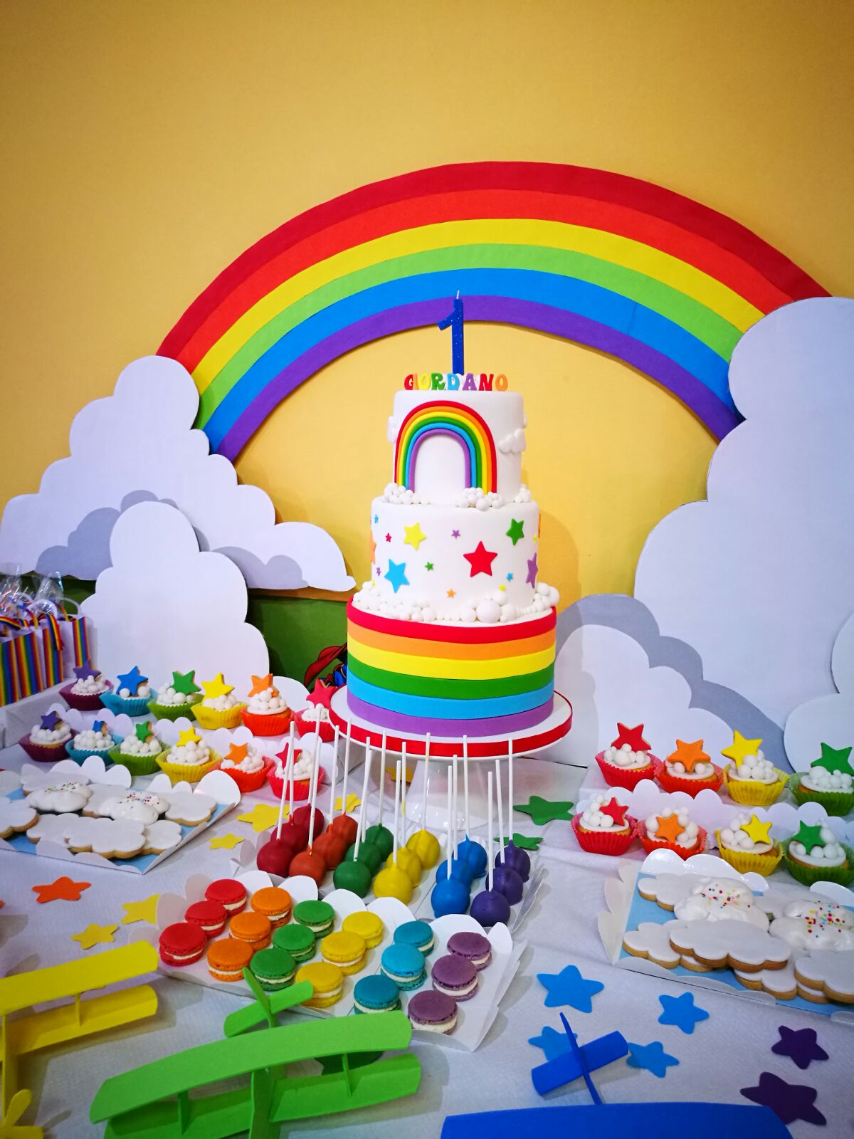 Poi finalmente arriva il primo compleanno di mio figlio e tutti a chiedere: che torta farai?! Risposta inaspettata: Nessuna! Perché stavolta, proprio per il primo compleanno di Giordano, ho potuto fare davvero ben poco, a causa di una doppia tendinite che da mesi mi impedisce di impastare e sfornare come vorrei! Un rapido giro di telefonate e il problema è risolto, ecco arcobaleno di amici pronti a venire in mio aiuto, Fabrizio, Donatella, Natascia, Sabina; io la mente, loro il braccio, e mai come stavolta la metafora è decisamente pertinente!