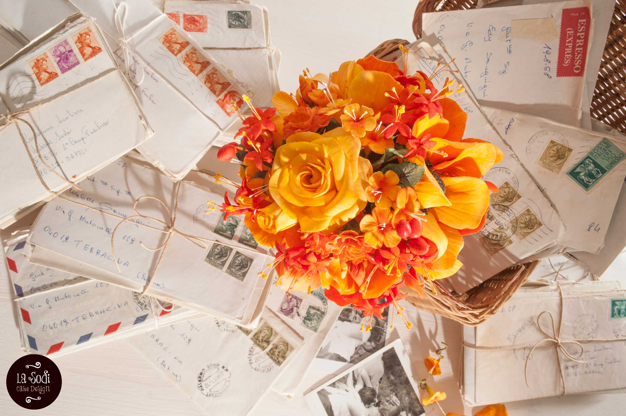 I fiori, le foto, le lettere, il cestino. Ogni singolo oggetto è un ricordo prezioso a cui solo il mio carissimo fotografo poteva donare la luminosa grazia che tanto amo di questi scatti; il concorso passa in secondo piano, è solo la scusa per mettere insieme tanti ricordi e fissarli per sempre in un’immagine per me tenera e infinitamente significativa. Amo la leggerezza in bianco e nero di queste polaroid d’altri tempi, due ragazzi distesi sull’erba durante un picnic estivo, la delicatezza di un gesto d’amore e la spensieratezza degli innamorati felici. I miei genitori. Le loro lettere, la corrispondenza che è arrivata a me come una magnifica eredità di ricordi, di francobolli antichi e indirizzi sbiaditi; mentre allestisco il set fotografico ho la sensazione di avere tra le mani cimeli preziosi che meritano un posto speciale fra le mie cose. Conservo gelosamente queste storie del passato nel mio cestino ammaccato dei tempi dell’asilo, che ora diventa contenitore per questo piccolo allegro bouquet, creato con l’infinita pazienza che mi sorprendo di avere, io che sono sempre così frettolosa e sbrigativa!