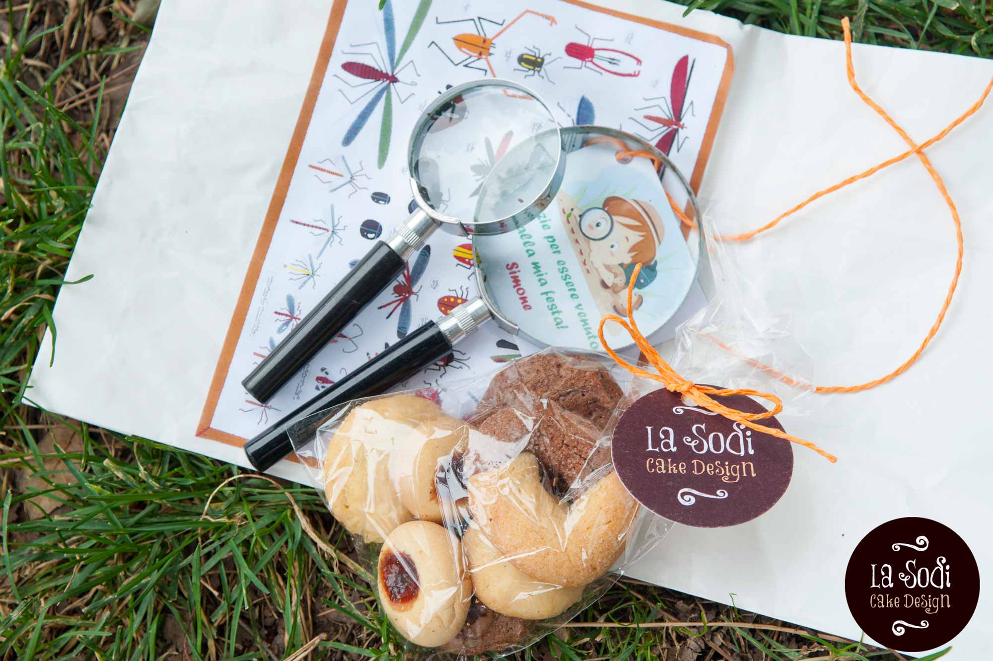 In questa merenda al parco, una festa un po’ al contrario, la doggy-bag è arrivata all’inizio: ogni invitato ha trovato il proprio sacchettino, una semplice bustina bianca per i cornetti, che potete trovare in tanti negozi di pasticceria o cartarie, decorata con un’immagine coloratissima con tanti insetti acquistata, per pochi euro, come pdf scaricabile su Etsy. All’interno della doggy-bag ho messo un sacchettino di biscotteria assortita (siate pazienti, vi scriverò presto tutte le ricette!), un succo di frutta e un piccolo regalino: la lente d’ingrandimento, con cui Simone ha voluto ringraziare i suoi amichetti!